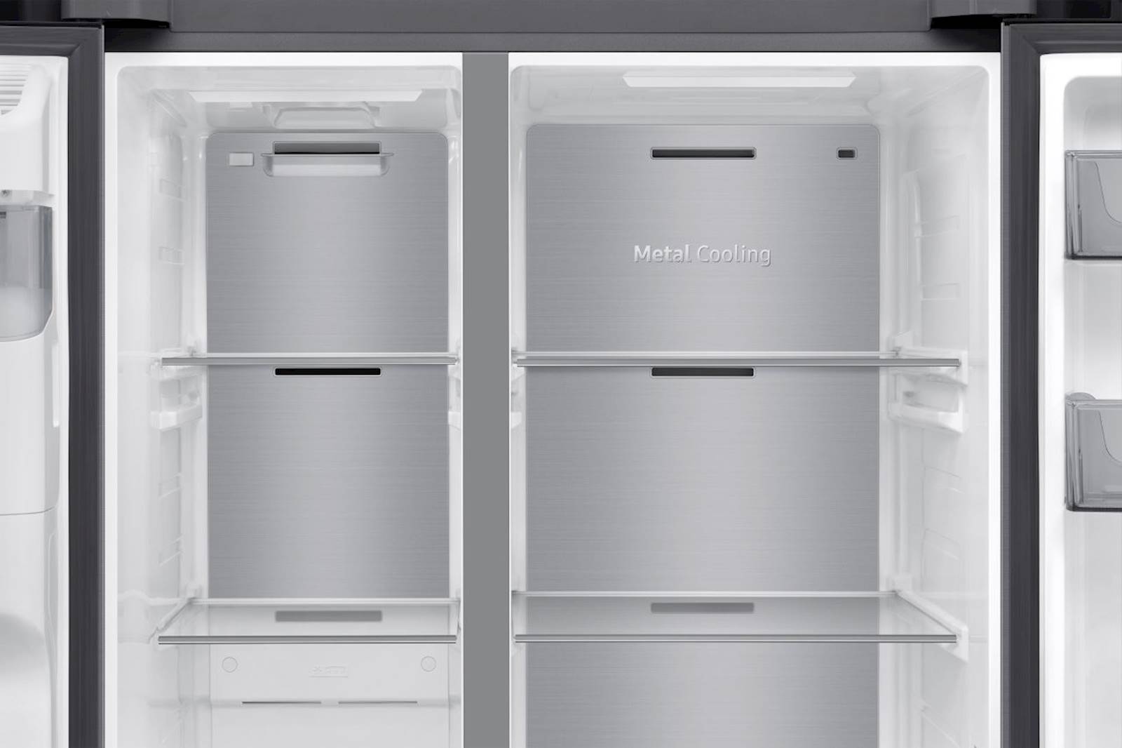 Nadzorujte in upravljajte svoj hladilnik kadarkoli in kjer koli. Vgrajeni Wi-Fi vam omogoča sledenje in prilagajanje njegovega delovanja z uporabo aplikacije SmartThings. Z lahkoto lahko nadzirate način hlajenja, spreminjate temperaturo in prejemate opozorila, če so vrata odprta. Zaradi SpaceMax™ tehnologije se stene hladilnika veliko tanjše. To vam omogoča, da v hladilnik shranite veliko količino živil. 13-kubični kompresor vzdržuje konstantno temperaturo in poskrbi, da je hrana dolgo časa sveža. Prav tako Twin Cooling prilagaja temperaturo in vlažnost v hladilniku in zamrzovalniku kar preprečuje mešanje vonjav in ohranja živila v idealnih razmerah. S pritiskom na gumb Power Freeze poskrbite za hiter dotok mrzlega zraka v zamrzovalnik, kar je priročno za hitro zamrzovanje živil in pripravo ledi.