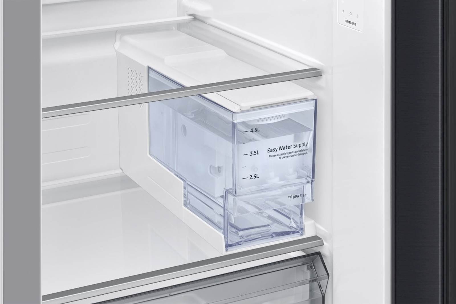 S hladilnikom Samsung RS70F65KEFEO lahko privarčujete do 10 % energije z načinom AI Energy v SmartThings Energy. Vgrajeni Wi-Fi vam omogoča sledenje in prilagajanje njegovega delovanja z uporabo aplikacije SmartThings. Nadzirate lahko način hlajenja, spreminjate temperaturo in prejemate opozorila, če so vrata odprta. Bixby, glasovni pomočnik, omogoča preprosto upravljanje funkcij hladilnika prek glasovnih ukazov. Zaradi tehnologije SpaceMax™ so stene hladilnika veliko tanjše, kar omogoča shranjevanje večje količine živil. Hladilnik lahko postavite kamor koli, saj razdelilnik za vodo in led deluje s 4,5-litrskim notranjim rezervoarjem, brez potrebe po priklopu na vodovod. Zaradi hlajenja z vseh strani hladilnik enakomerno porazdeli hladen zrak po vseh predelih, kar zagotavlja, da so živila vedno sveža. Funkciji Power Cool in Power Freeze omogočata hitro hlajenje in zamrzovanje, kar je še posebej uporabno, ko želite hitro ohladiti ali zamrzniti večje količine hrane.