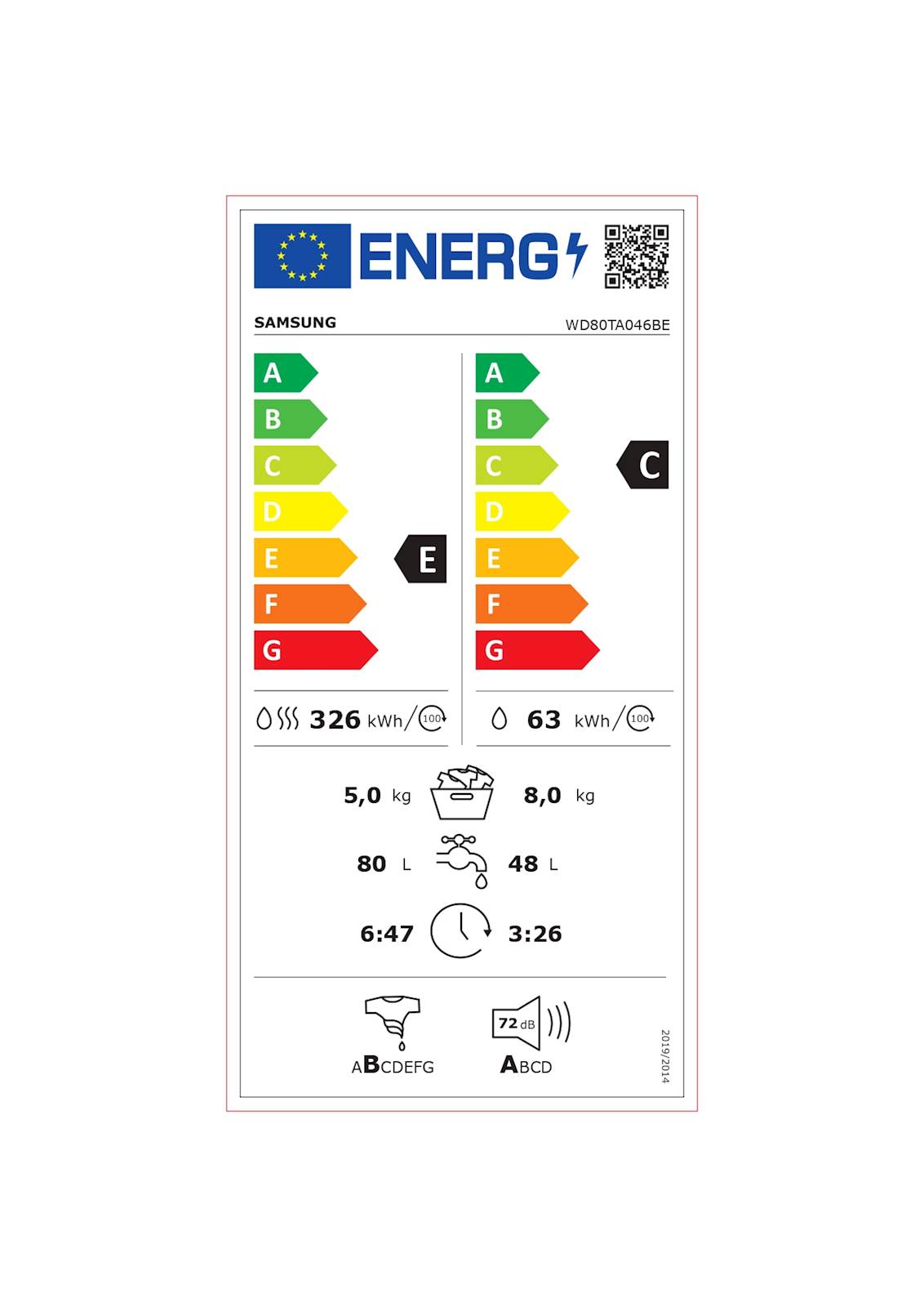 Specifikacije: https://www.samsung.com/si/washers-and-dryers/washer-dryer-combo/wd5000t-front-loading-air-wash-drum-clean-bubble-soak-8kg-plus-5kg-white-wd80ta046be-le/Energijska nalepka: https://eprel.ec.europa.eu/labels/washerdriers2019/Label_262298.pdfInformacijski list: https://eprel.ec.europa.eu/fiches/washerdriers2019/Fiche_262298_SL.pdfZmogljivost pranja: 8 kgZmogljivost sušenja: 5 kgRazred energijske učinkovitosti pranja in sušenja: ERazred energijske učinkovitosti pranja: CNajvečja hitrost ožemanja: 1400Globina do 50 cm: NeGlobina do 50 cm dodatno: 60 cmInverter motor: DaPoraba energije na 100 ciklov pranja in sušenja: 326 kWhPoraba energije na 100 ciklov pranja: 63 kWhGlasnost med ožemanjem: 72 dBZamik vklopa: DaVarovalo za otroke: DaTehnologija pranja: Bubble Soak tehnologija, Ecobubble, Drum Clean.Upravljanje na daljavo: NeMere (Š x V x G): 600 x 850 x 600 mm, globina z vrati 680 mmTeža: 66 kgGarancija v mesecih: 24