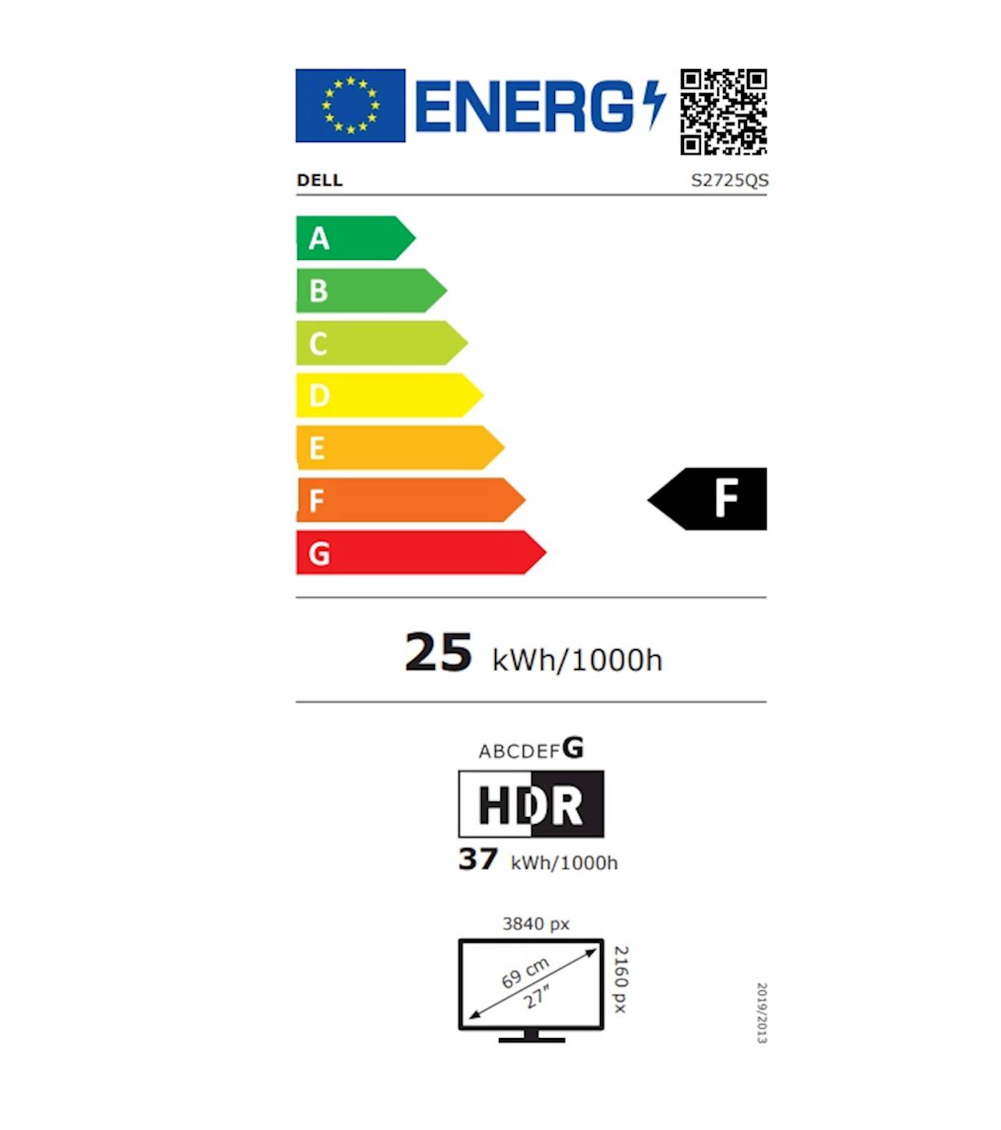 Energijska nalepka: https://eprel.ec.europa.eu/labels/electronicdisplays/Label_2186111.pdfInformacijski list: https://eprel.ec.europa.eu/screen/product/electronicdisplays/2186111Specifikacije: https://dl.dell.com/content/manual3764833-dell-27-plus-4k-monitor-s2725qs-simplified-service-manual.pdf?language=en-usVelikost zaslona: 68,58 cm (27,0")Ločljivost: 3840 x 2160 ( 4K )Ločljivost dodatno: , razmerje 16:9, nebleščečNastavljiv po višini: DaNastavljiv po višini dodatno: , do 130 mmZaslon na dotik: NeZvočniki: DaZvočniki dodatno: 2x 5WUkrivljen zaslon: NePrilagodljivo osveževanje: AMD FreeSync PremiumNamen monitorja: Domača rabaPriključki: 2x HDMI 2.1, Priključki dodatno: 1x DisplayPort 1.4Tip matrike: IPSSvetilnost: 350 cd/m2Kontrast: 1.500 : 1Odzivni čas: 4 ms (siva na sivo)Velikost pike: 0.1554 mmVidni kot: 178° vertikalno / 178° horizontalnoHitrost osveževanja: 120 HzŠtevilo barv in barvni gamut: 1,07 milijarde, 99% sRGB (CIE 1931)Nastavljivost zaslona : nagib (Tilt) -5° do 21°, vodoravni zasuk (Swivel) -30° do 30°, obračanje (Pivot) -90° do 90°, višina do 130 mmVESA standard: 100 mm x 100 mmBarva: siva / črnaEnergijski razred: FMere (Š x V x G): 611.6 mm x 388,6 mm ~ 518.6 mm x 200,4 mmMere brez stojala: 611.6 mm x 356,1mm x 59.9 mmTeža: 4,56 kg (brez stojala)/ 6,47 kg (s stojalom)Dodatne informacije: Energy Star 8.0, HDR Ready, Comfortview PlusPriloženo: monitor, stojalo, napajalni kabel, HDMI kabel, navodila za uporaboGarancija v mesecih: 36