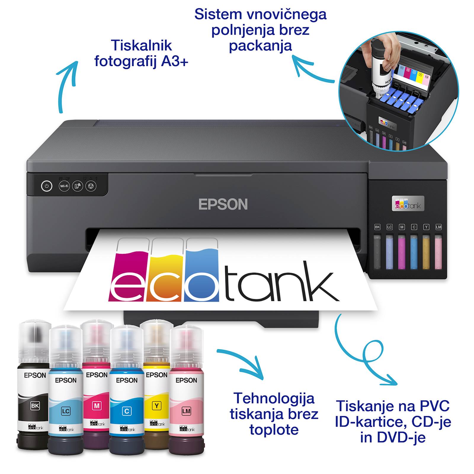 - Specifikacije: https://www.epson.si/sl_SI/izdelki/tiskalniki/inkjet/potro%c5%a1nik/epson-l18050/p/34293Tehnologija tiskanja: brizgalni barvni na flaškeMaksimalna dimenzija tiskanja: A3+Namembnost: domača uporaba/mala podjetjaHitrost tiskanja: do 20 str/minHitrost tiskanja dodatno: , 8 Strani/minuto Črno-bel, 8 Strani/minuto barvnoPovezljivost tiskalnika: USB, WiFiSamodejno obojestransko tiskanje: neLočljivost tiskanja: 5.760 x 1.440 pik na palecNajvečji priporočen obseg tiskanja: /Standardna kapaciteta papirja: 100 listov, 20 fotografskih listovPriložena črnila: Šest posameznih 70-ml stekleničk (črna, cijan, rumena, magenta, svetla cijan, svetla magenta)Priložena črnila dodatno: , serija 108Dimenzije (Š x V x G): 523 x 150 x 369 mmTeža: 14,36kgDodatne informacije: Tiskanje brez robov, Tisk na CD-je/DVD-je, Epson Smart Panel AppGarancija v mesecih: 12Garancija v mesecih dodatno: , (brezplačno podaljšanje garancije na skupno 3 leta ob registraciji na spletni strani)