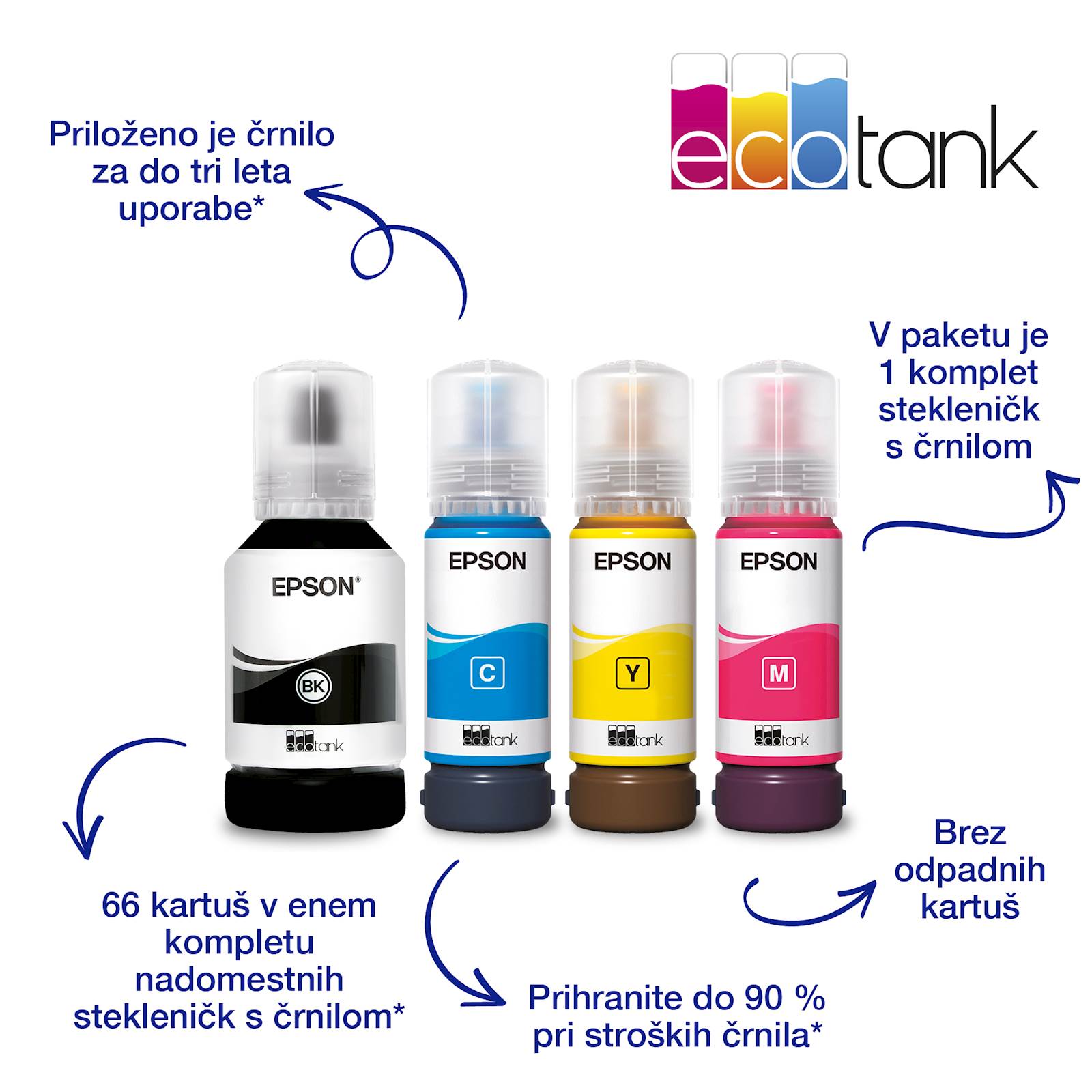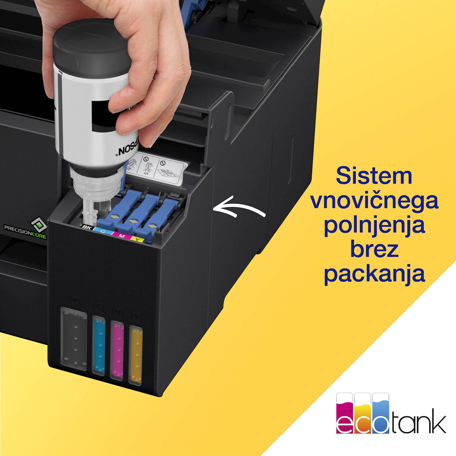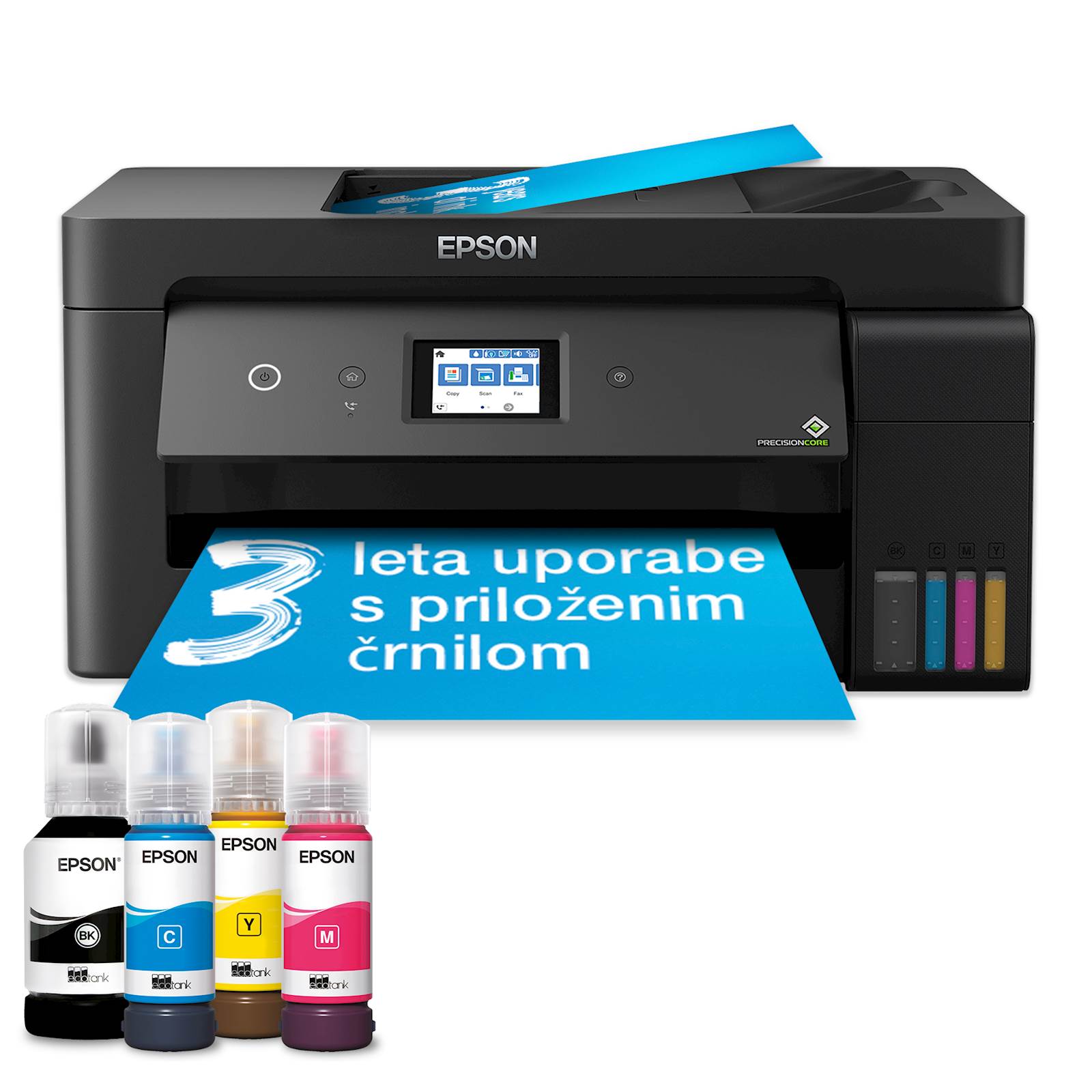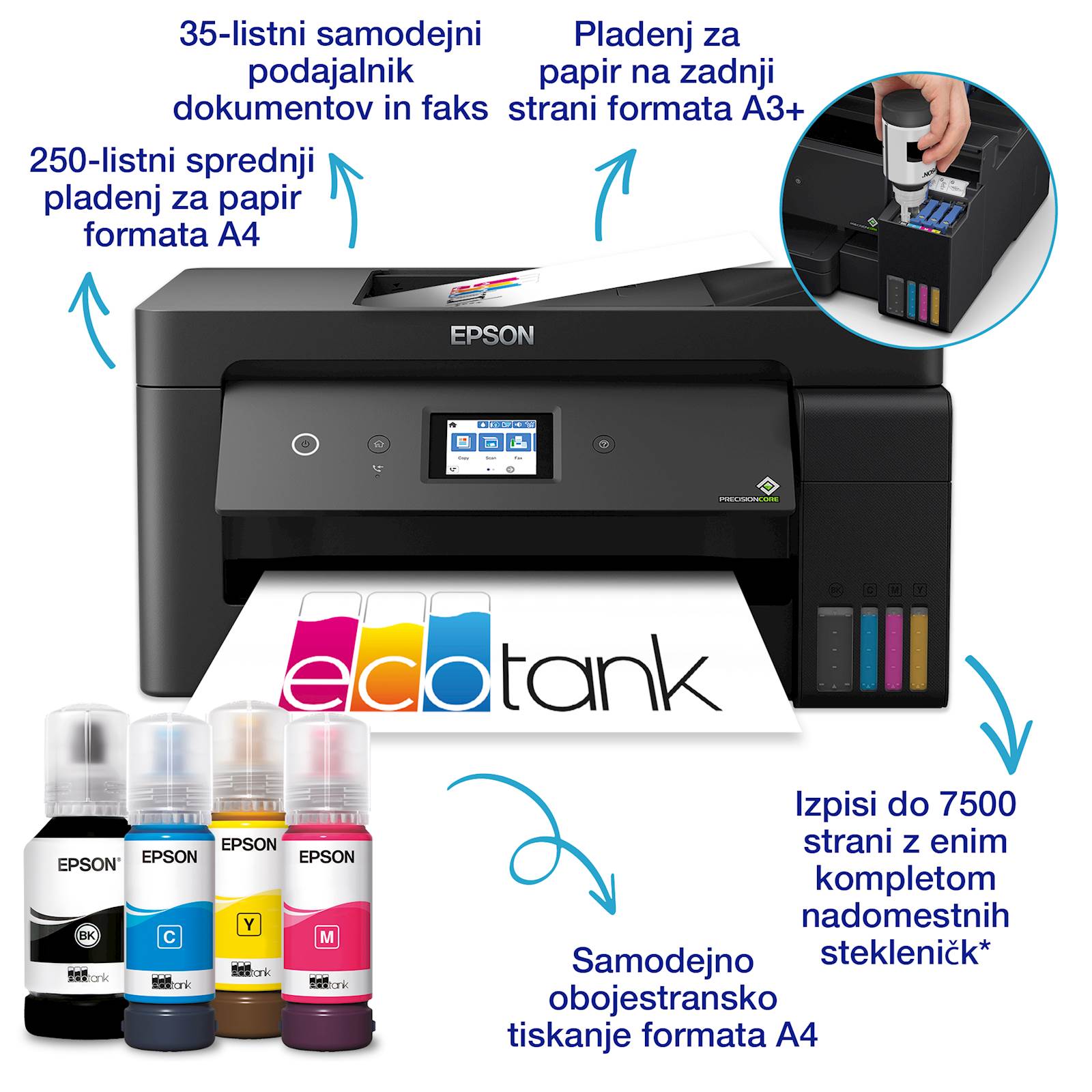 - Specifikacije: https://www.epson.si/products/printers/inkjet-printers/for-home/ecotank-l14150?productfinder=L14150Specifikacije: https://support.epson.net/setupnavi/?LG2=SL&OSC=WS&MKN=L14150&toppage=&PINF=menuSpecifikacije: https://support.epson.net/p_pubs/index.php?model=L14150%20Series&lang=SLSpecifikacije: https://www.epson.si/promotions/extended-warrantyTehnologija tiskanja: brizgalni barvni na flaškeMaksimalna dimenzija tiskanja: A3+Namembnost: domača uporaba/mala podjetjaHitrost tiskanja: do 20 str/minHitrost tiskanja dodatno: 17 str/min čb, 9 str/min barv.Povezljivost tiskalnika: USB, Mreža, WiFIPovezljivost tiskalnika dodatno: , Wi-Fi directSamodejno obojestransko tiskanje: daSamodejno obojestransko tiskanje dodatno: , samo A4 (običajen papir)Ločljivost tiskanja: do 4800 x 2400 dpiNajvečji priporočen obseg tiskanja: /Možnost faksiranja: daSamodejni podajalnik dokumentov: daSamodejni podajalnik dokumentov dodatno: , samo A4 (običajen papir)Obojestransko skeniranje: neStandardna kapaciteta papirja: 250 listovPriložena črnila: Bk 127ml za 6200 strani in CMY 70ml za 5200 straniDimenzije (Š x V x G): 498 x 245 x 358 mmTeža: 9,7 kgDodatne informacije: Epson Connect (iPrint, Email Print, Remote Print Driver, Scan-to-Cloud), Apple AirPrintGarancija v mesecih: 12 + (brezplačno podaljšanje garancije na skupno 3 leta ob registraciji na spletni strani)