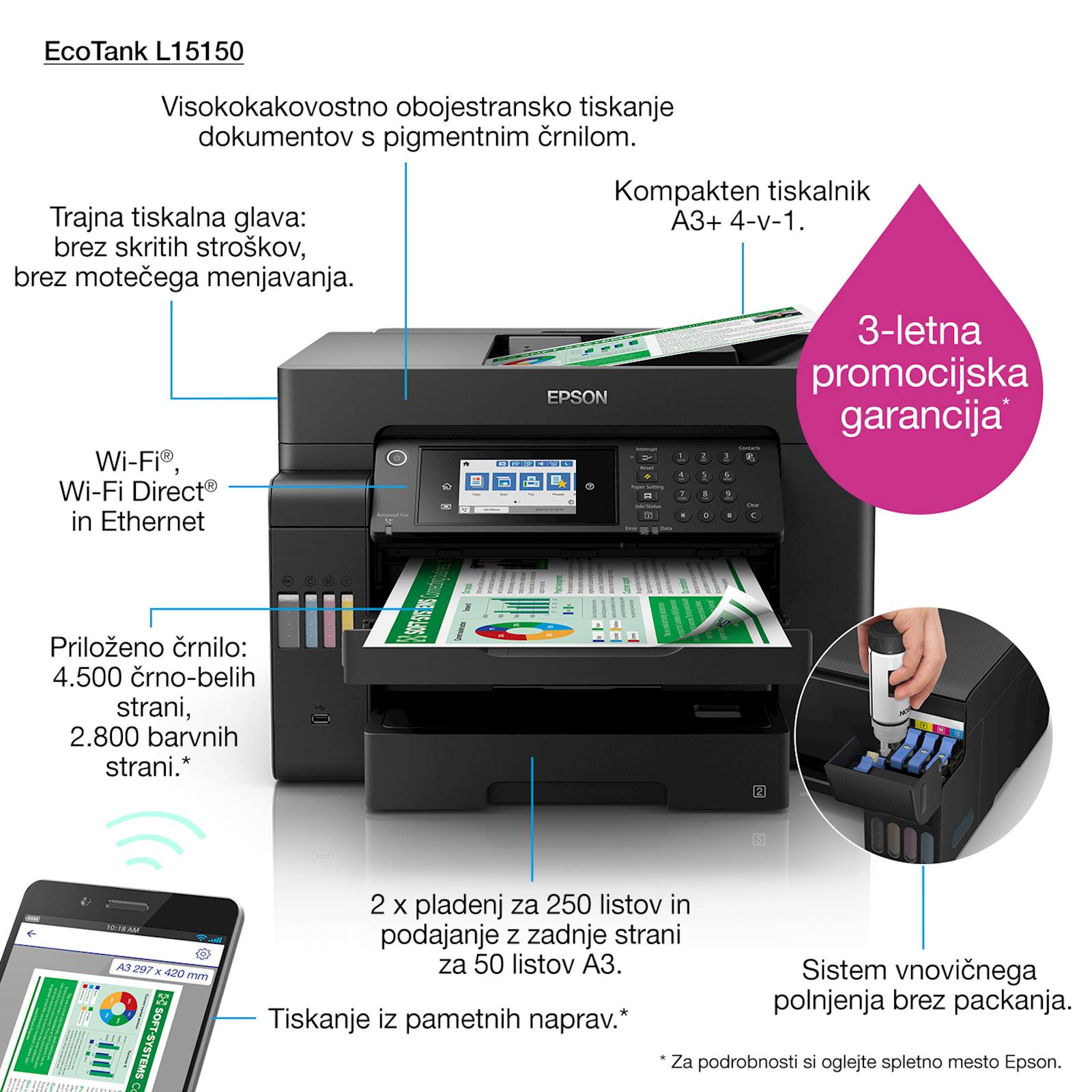 - Specifikacije: https://www.epson.si/products/printers/inkjet-printers/for-home/ecotank-l15150#detailsSpecifikacije dodatno: Tehnični podatkiSpecifikacije: https://www.epson.si/promotions/extended-warrantySpecifikacije dodatno: Brezplačno podaljšanje garancije na 3 letaTehnologija tiskanja: brizgalni barvni na flaškeMaksimalna dimenzija tiskanja: A3+Namembnost: domača uporaba/mala podjetjaHitrost tiskanja: do 30 str/minHitrost tiskanja dodatno: 25 str/min čb, 12 str/min barv.Povezljivost tiskalnika: USB, Mreža, WiFIPovezljivost tiskalnika dodatno: , Wi-Fi directSamodejno obojestransko tiskanje: daSamodejno obojestransko tiskanje dodatno: , A4/A3Ločljivost tiskanja: do 4800 x 2400 dpiNajvečji priporočen obseg tiskanja: /Možnost faksiranja: daSamodejni podajalnik dokumentov: daObojestransko skeniranje: daStandardna kapaciteta papirja: 500 listov (2x 250), ustrezna teža papirja 64 g/m2 - 255 g/m2Priložena črnila: Bk za 4500 strani in CMY za 2800 straniDimenzije (Š x V x G): 515? x 350 x 500 mmTeža: 20,2 kgDodatne informacije: obojestranko tiskanje, skeniranje, kopiranje (A4/A3)Garancija v mesecih: 12 + (brezplačno podaljšanje garancije na skupno 3 leta ob registraciji na spletni strani)