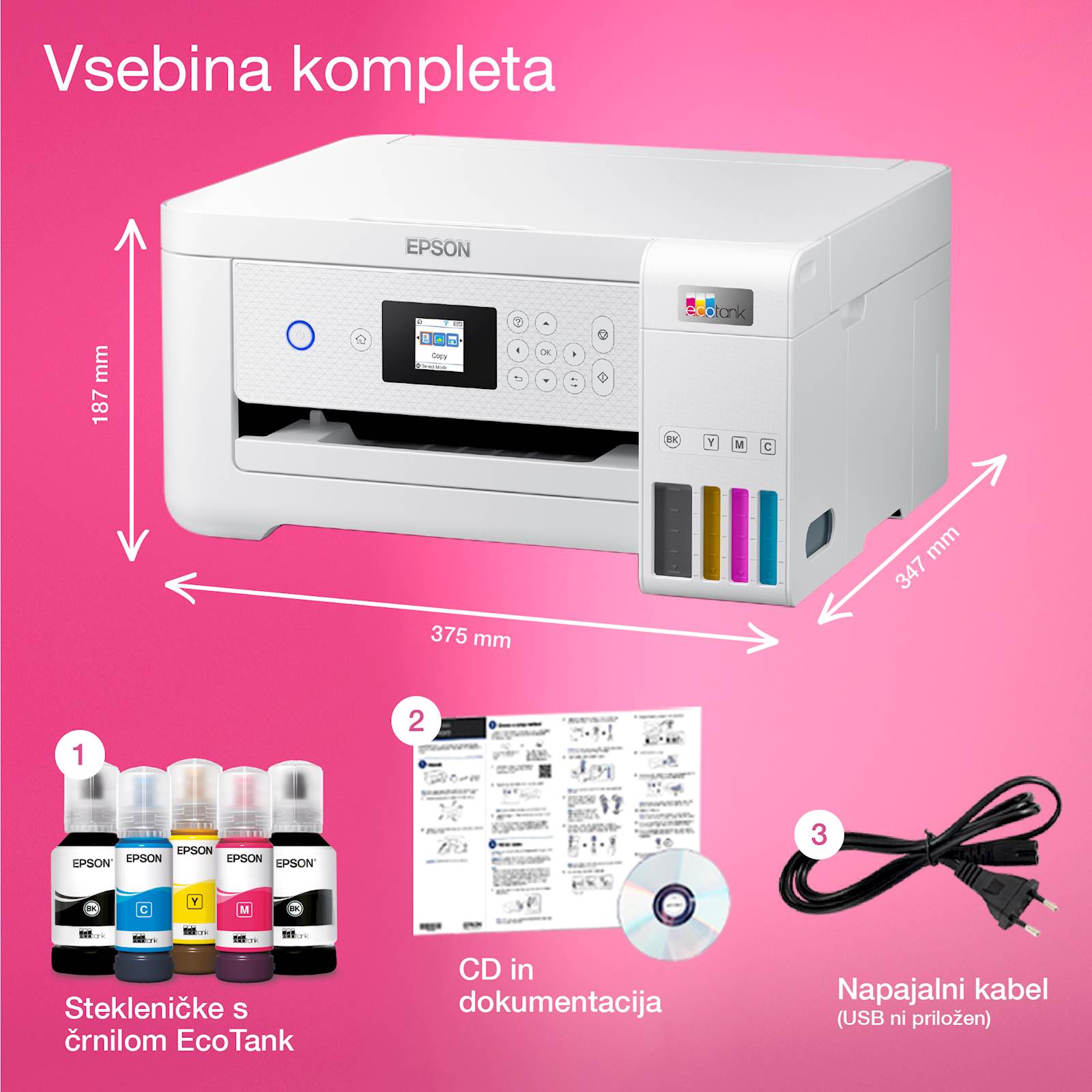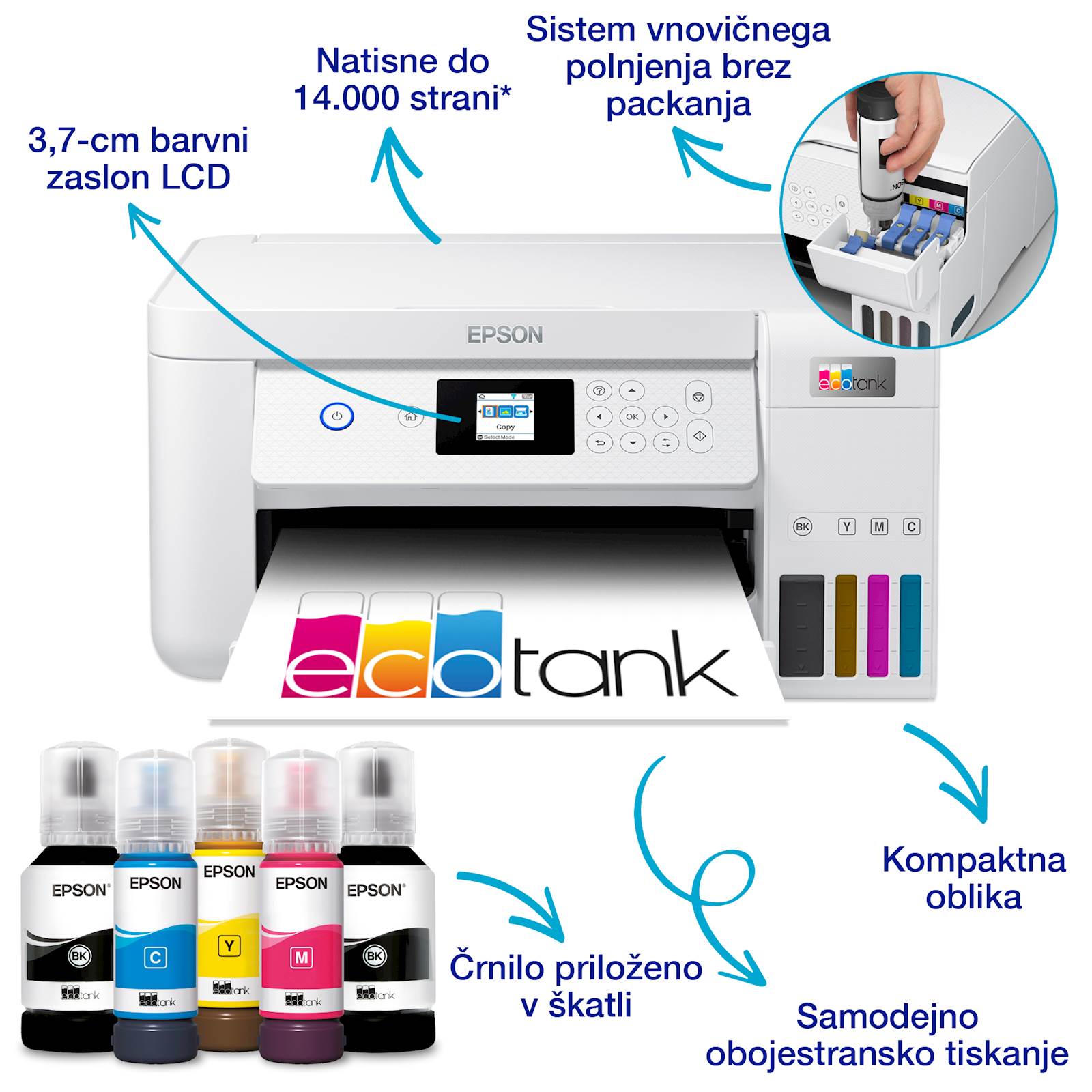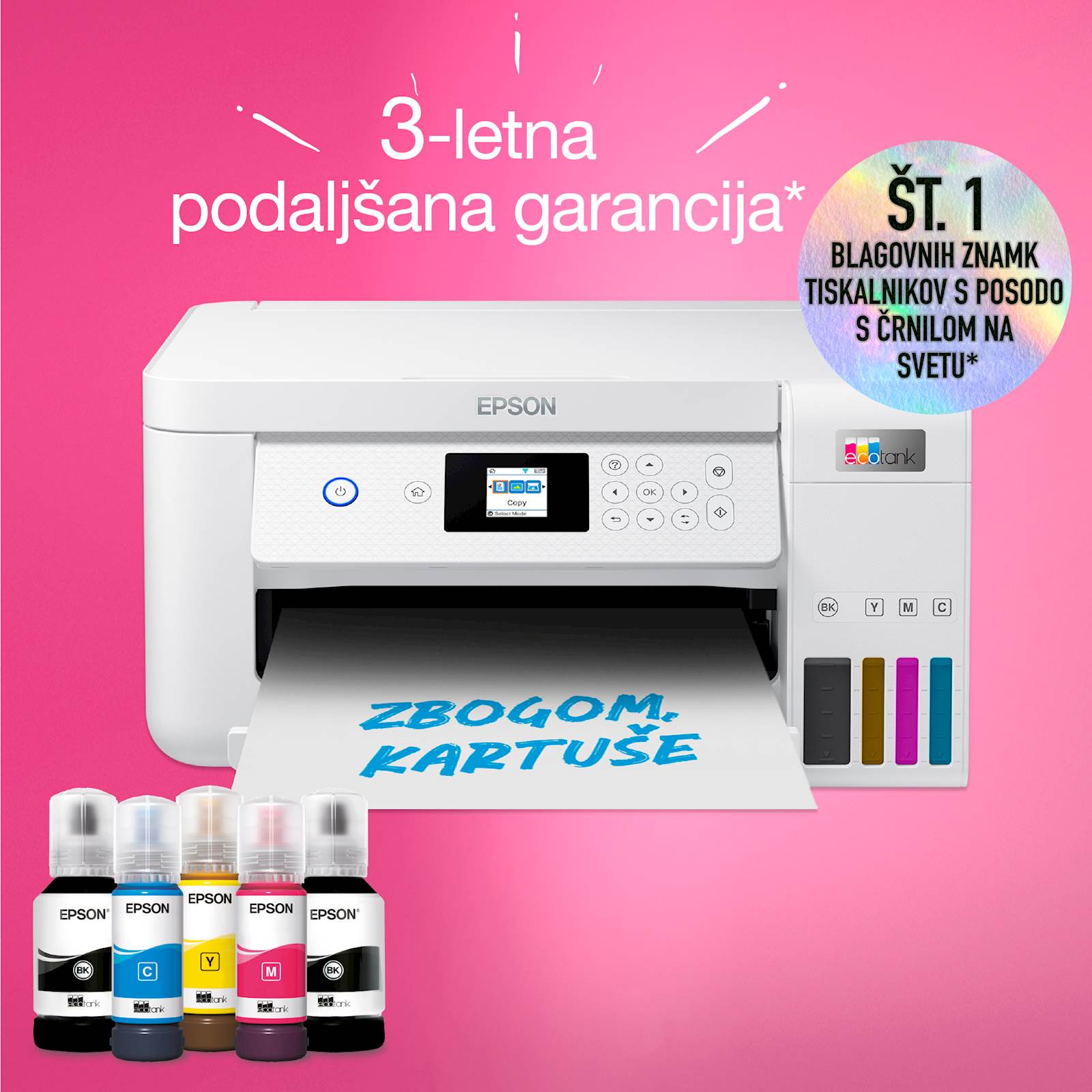 - Specifikacije: https://www.epson.si/sl_SI/izdelki/tiskalniki/inkjet/potro%c5%a1nik/ecotank-l4266/p/31098Specifikacije: https://www.epson.si/promotions/extended-warrantySpecifikacije: https://support.epson.net/setupnavi/?LG2=SL&OSC=WS&MKN=L6270&toppage=&PINF=menuSpecifikacije: https://www.epson.si/for-home/ecotankTehnologija tiskanja: brizgalni barvni na flaškeMaksimalna dimenzija tiskanja: A4Namembnost: domača uporaba/mala podjetjaHitrost tiskanja: do 20 str/minHitrost tiskanja dodatno: 10,5 str/min ČB, 5 str/min barv.Povezljivost tiskalnika: USB, WiFiPovezljivost tiskalnika dodatno: , Wi-Fi DirectSamodejno obojestransko tiskanje: daLočljivost tiskanja: do 5760 x 1440 dpiNajvečji priporočen obseg tiskanja: /Možnost faksiranja: neSamodejni podajalnik dokumentov: neObojestransko skeniranje: neStandardna kapaciteta papirja: 100 listovPriložena črnila: Bk (pigment) za 14.000 strani in CMY za 5.200 straniDimenzije (Š x V x G): 375? x 187 x 347 mmTeža: 5,4 kgDodatne informacije: podpora za novo mobilno aplikacijo Smart panelDodatne informacije dodatno: , Apple AirPrintGarancija v mesecih: 12 + (brezplačno podaljšanje garancije na skupno 3 leta ob registraciji na spletni strani)
