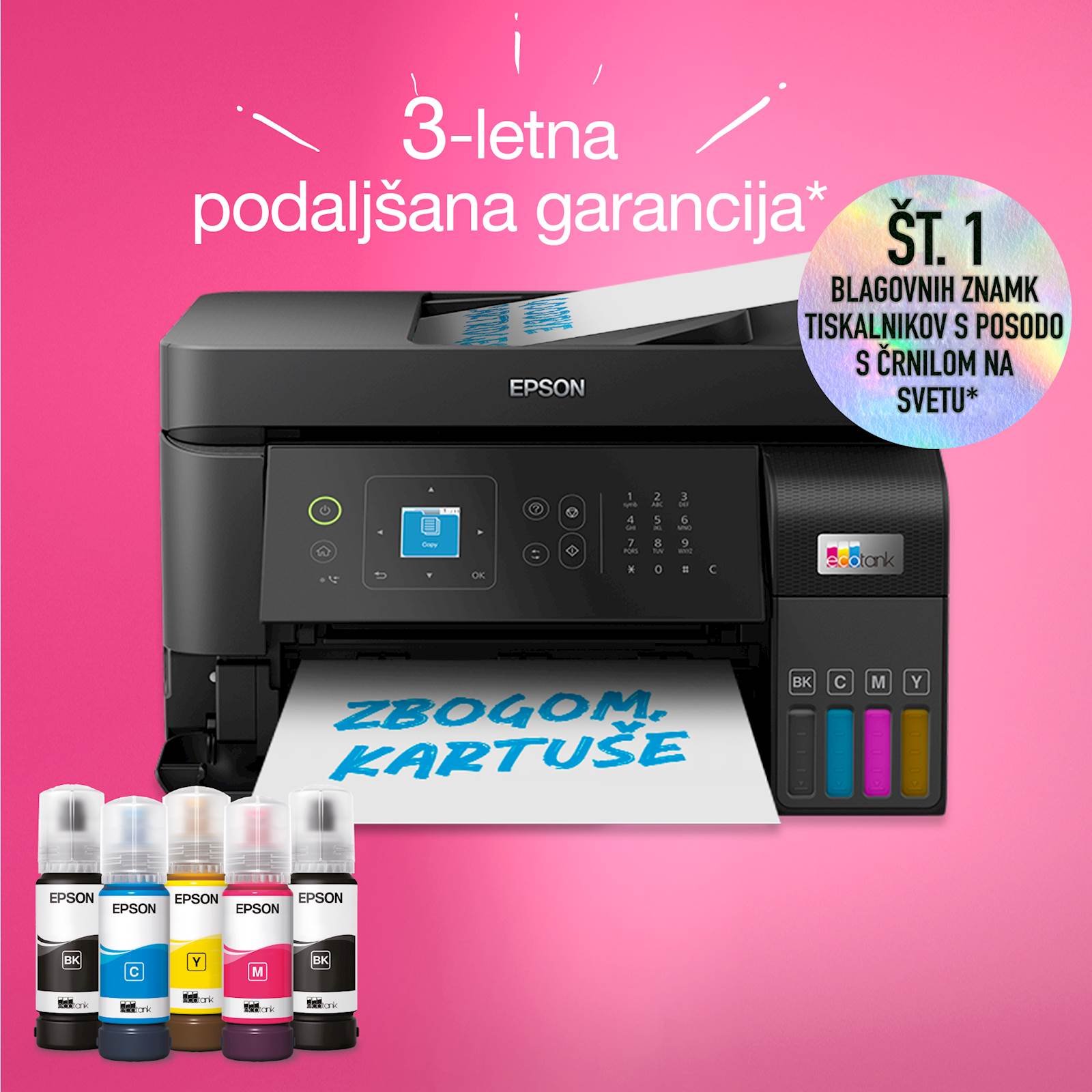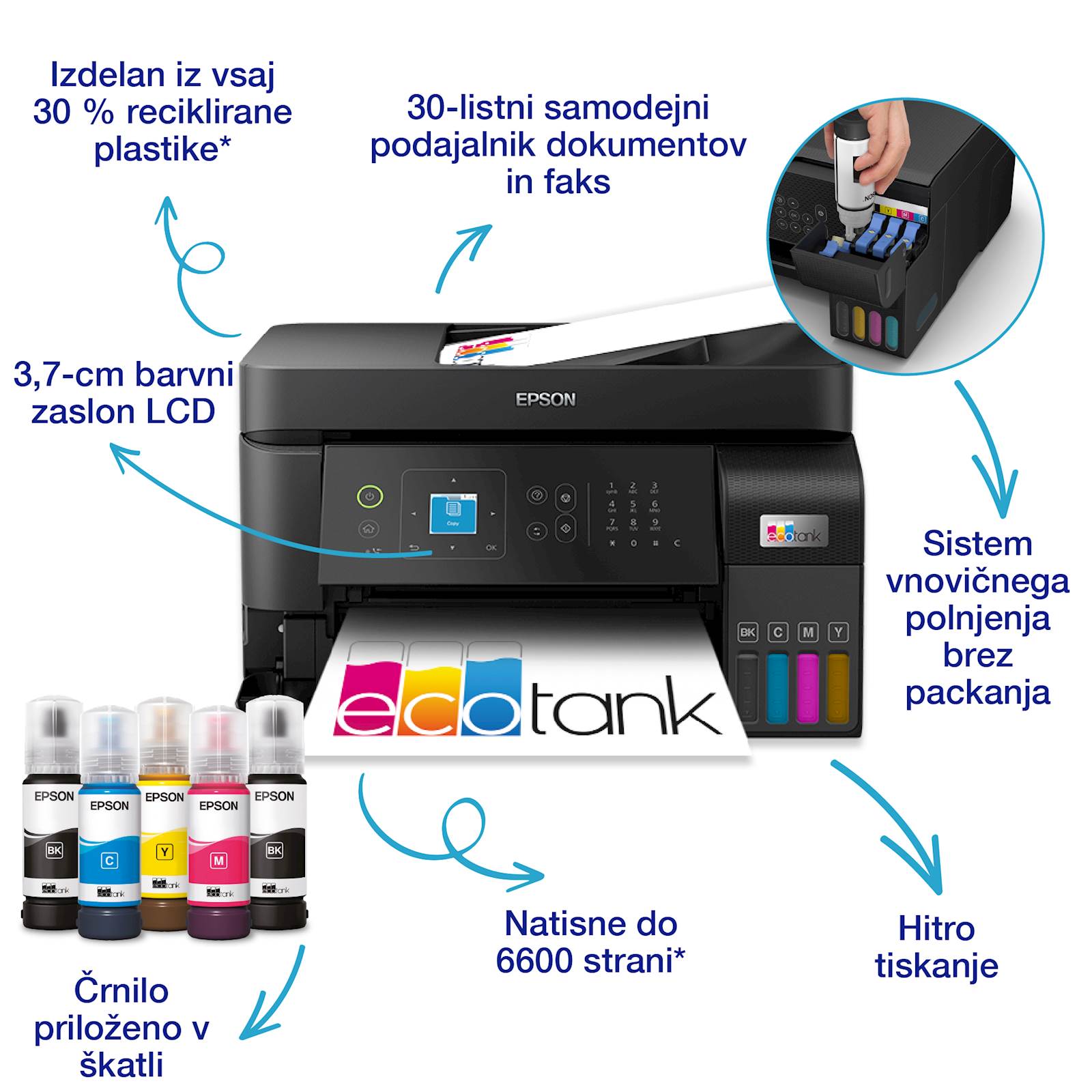 - Specifikacije: https://www.epson.si/sl_SI/izdelki/tiskalniki/inkjet/potro%C5%A1nik/ecotank-l5590/p/35112Specifikacije: https://support.epson.net/setupnavi/?MKN=L5590&PINF=menu&LG2=SLTehnologija tiskanja: brizgalni barvni na flaškeMaksimalna dimenzija tiskanja: A4Namembnost: domača uporaba/mala podjetjaHitrost tiskanja: do 20 str/minHitrost tiskanja dodatno: 15 str/min čb, 8 str/min barv.Povezljivost tiskalnika: USB, Mreža, WiFIPovezljivost tiskalnika dodatno: , Wi-Fi DirectSamodejno obojestransko tiskanje: neLočljivost tiskanja: do 4800 x 1200 dpiNajvečji priporočen obseg tiskanja: /Možnost faksiranja: daSamodejni podajalnik dokumentov: daObojestransko skeniranje: neStandardna kapaciteta papirja: 100 listov, 20 fotografski papir, gramatura papirja 64 - 300g/m2Priložena črnila: Bk za 6600 strani in CMY za 5900 straniDimenzije (Š x V x G): 375? x 237 x 347 mmTeža: 5,2 kgDodatne informacije: aplikacija Smart panel, , Apple AirPrint, tiskanje brez robov (do 10 x 15 cm)Dodatne informacije dodatno: Štiri 65-ml posamezne stekleničke s črnilom (črnim, cijan, rumenim, magenta) + 1 dodatna črna stekleničkaGarancija v mesecih: 12 + (brezplačno podaljšanje garancije na skupno 3 leta ob registraciji na spletni strani)