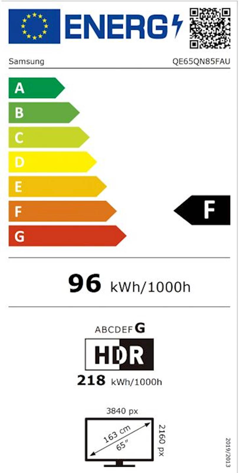 - Energijska nalepka: https://images.samsung.com/is/content/samsung/p6/common/energylabel/common-energylabel-qe65qn85fauxxh-energylabel.pdfInformacijski list: https://images.samsung.com/is/content/samsung/p6/common/energylabel/common-energylabel-qe65qn85fauxxh-productfiche.pdfDiagonala zaslona: 165 cm (65'')Ločljivost zaslona: 3840 x 2160 4K UHDTip zaslona: Mini LED QLEDSmart TV: TizenOsveževanje zaslona: 100HzOsveževanje zaslona dodatno: (do 144Hz)HDR : DAHDR dodatno: Neo Quantum HDR, HDR 10+, Auto HDR RemasteringDodatne TV lastnosti: Supreme UHD Dimming, 4K AI Upscaling, Filmmaker Mode, EyeComfort ModeSistem zvočnikov: 40W, 2.2CHZvok: 360 Audio, Dolby Atmos, Q-Symphony, OTS Lite, Adaptive Sound ProProcesor: NQ4 AI Gen2 ProcessorPovezave: BT5.3, WiFi5, Ethernet (LAN)Priključki: 4x HDMI, 2x USB-A, CI SlotSprejemnik: DVB-T2CS2Daljinski upravljalnik: TM2360ETeža: 24.0 kg (s stojalom), 22.7 kg (brez stojala)Mere (Š x V x G): 1446.5 x 887.9 x 279.4 mmMere brez stojala: 1446.5 x 829.5 x 46.3 mmEnergetski razred: FBarva: ECLIPSE SILVERVESA standard: 400 x 300 mmGarancija v mesecih: 24m